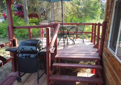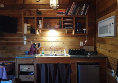 Perfect for 3-4 guests, the Tufted Puffin Cabin offers a kitchenette with a small refrigerator, sink, and a two-burner gas stove. Enjoy meals at the dining table and unwind in full mattress bunk beds or a bedroom with a full mattress. The full bathroom includes a tub/shower, and the porch provides a breathtaking view overlooking the lake.